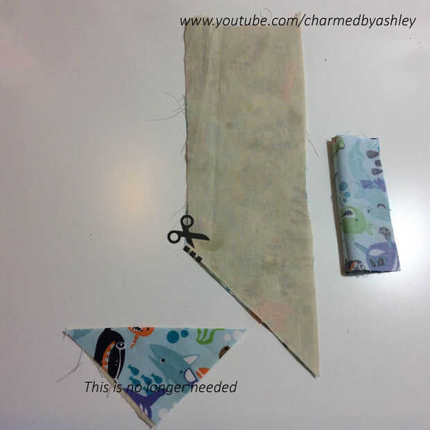 poner el estabilizador y el tejido elegido juntos (derecho contra derecho hacia fuera) doblez como se muestra en la foto y el corte donde se muestra la línea de corte