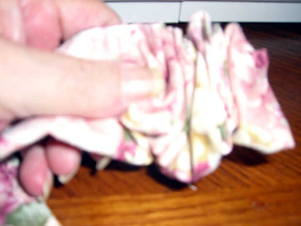 Mientras que sostiene el push pin la tela sobre ella y tire hacia abajo. Repita hasta que el arco es lado derecho dado vuelta hacia fuera. Una alternativa es plegar el borde y utilizar una varilla de pasador para empujar a la tela hasta que quede de lado derecho hacia fuera.