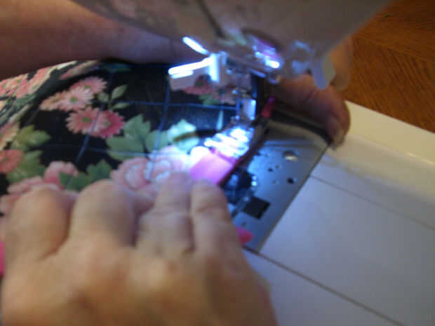 Nota: he encontrado que en este punto las capas será muy abultadas y duro de trabajar, cuando comience el pespunte para bloquear tus puntadas en lugar de inicio por delante de la esquina y pespuntes, sujete los hilos colgantes y utilizarlas para tirar suavemente y guiar su tela en la puntada hacia adelante para mover fácilmente sobre esta área.