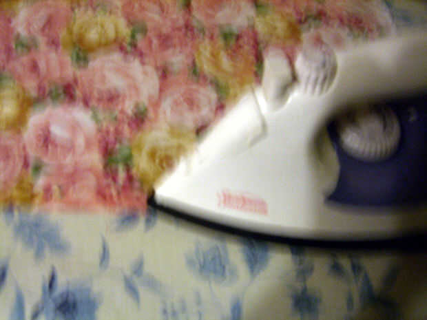 Cortar un trozo de witchery de puntada el ancho de la tela y coloque dentro del dobladillo presionado.