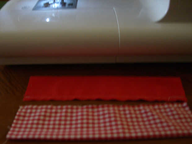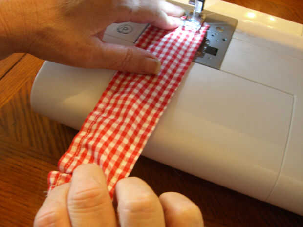 Coloque la tira en la máquina de coser y sujetando un extremo para estirar el elástico de la longitud de la puntada puntada en el pasador de 1/2 pulgada ambos lados para sujetar el elástico en su lugar (opcional). Derecho contra derecho coser los extremos juntos y voltear el Servilletero o scrunchie adentro hacia fuera.