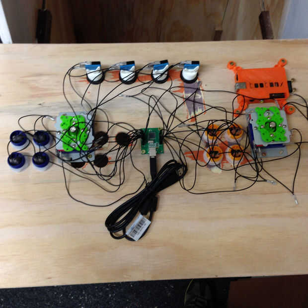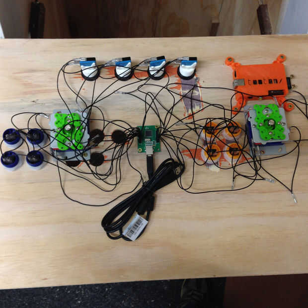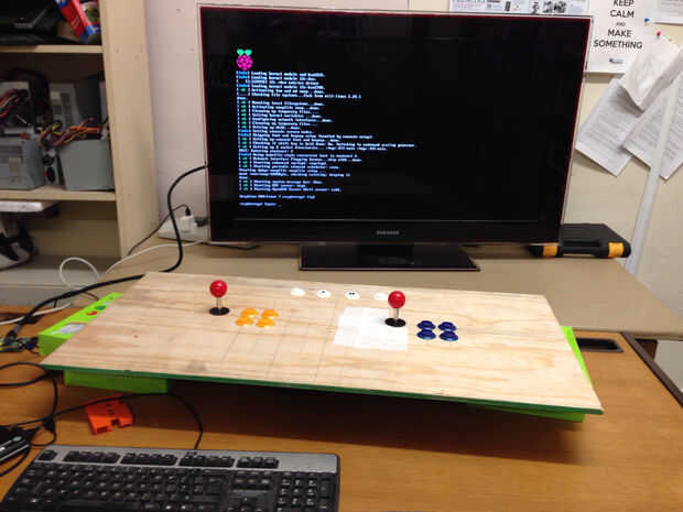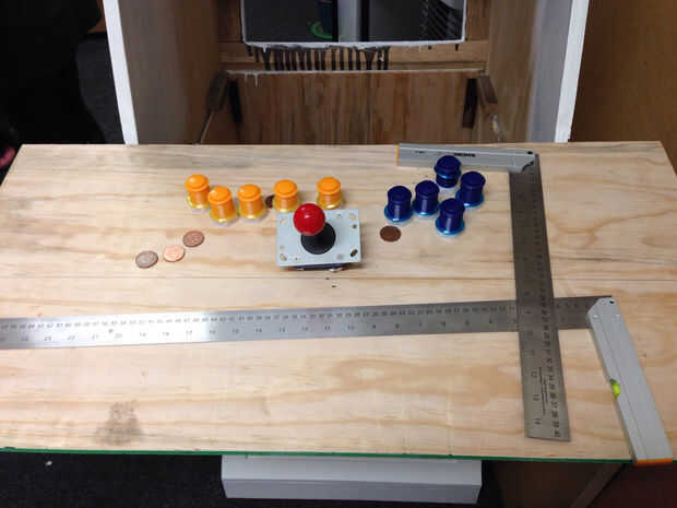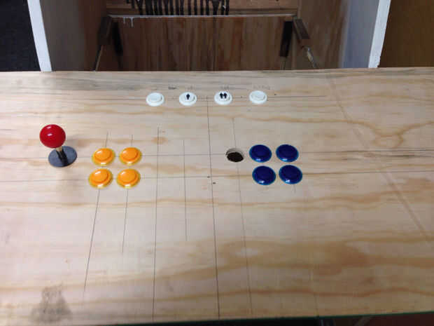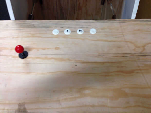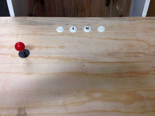 La clave para un gabinete de arcade retro es la vieja escuela botones y joysticks. Hemos perforado los agujeros en la madera contrachapada para instalarlos físicamente. Inicialmente tratamos de conectarlos via USB, cuando luchábamos por los mapa, hemos cambiado de táctica y enganchado en su lugar ellos hasta la GPIO pins en la Raspberry Pi. Utilizamos un diagrama de la Página Web de elemento 14 para saber que pines utilizar: