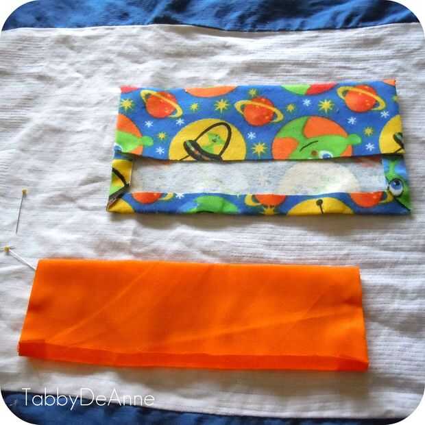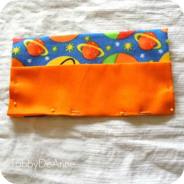 Perno de la tela se abaten cada pocas pulgadas para asegurar que una vez que usted empiece a coser, su proyecto se convertirá como deseado. También quiere conseguir su cinta cubrió. Corte la cinta a un buen tamaño largo. Corte mina 16 pulgadas de largo y me doblé por la mitad. Una vez que se dobla por la mitad desea pin encima de la tela llana en aproximadamente un cuarto de pulgada. Usted quiere asegurarse de que está dentro de lo suficiente como para ser cosidos a través con la costura.