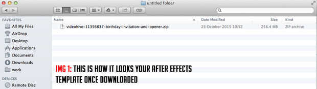 2 Seleccione la plantilla que acabas de descargar de videohive (img1) y descomprimir la carpeta (img2). Elegir que versión se necesita chico o chica y abra la carpeta. Seleccione el icono morado llamado "Bithday_Invitation_and_Opener_boy.aep" y haga doble clic para abrir el proyecto en After Effects (img3).