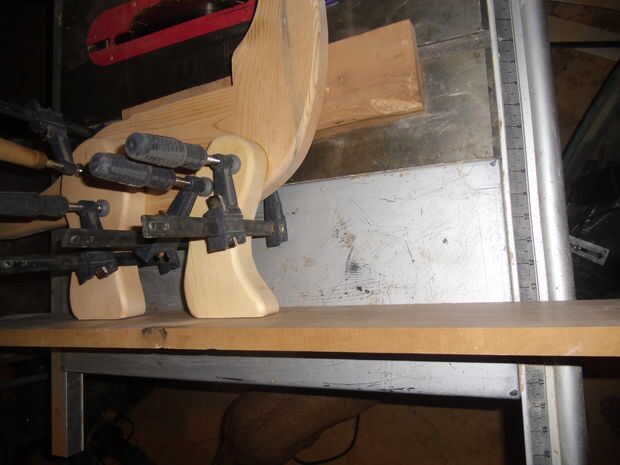 Fijar las patas a continuación. Es más fácil que el cuerpo acostado sobre una tabla para que puedan alcanzar las abrazaderas por debajo sin molestar nada. Entonces colóquelos aproximadamente donde quieren y ponen una tabla plana en el borde paralelo al cuerpo. Esto le permitirá alinear las piernas a una superficie plana, sorteo una vez alineado su contorno en el cuerpo, aplicar pegamento y prendieron la pierna. Si usted mueva la pierna alrededor para untar el pegamento se moverá menos cuando se intenta sujetar. Asegúrese de que se fije que las piernas no pasar de ser plana a la Junta. No hay medir aquí a molestar con, asegúrese de que se ven bien en la ubicación en el cuerpo y están bien espaciados. Es importante que la pierna delantera tiene la costura del cuerpo debajo de la mitad del mismo. La costura es el punto débil de todo pero con una pierna pegado en cada lado se llevará a cabo completamente.