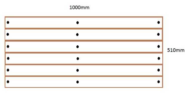 Una vez que el marco se hace la madera del suelo puede ser cortado, la razón de corte ahora es asegurarse de que el marco es en realidad 1000mm que el marco es más largo o más corto corte el temporizador de suelo para ese tamaño. Una vez que se cortan las tablas podría haber un poco de proyección. Decidimos dejarlo, pero se puede quitar. Los empalmes de lengüeta y ranura para crear una pieza sólida de madera del pegamento. Cada tabla debe atornillarse luego en tres lugares como se muestra en la imagen.