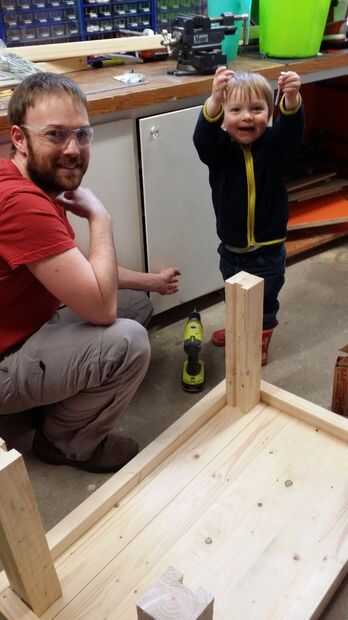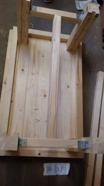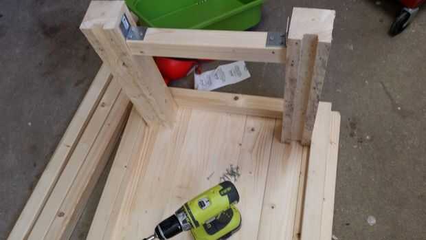 Cortar las piernas a la altura deseada, para nosotros eso 450mm menos el espesor de la tabla. Así que fue alrededor de 435 mm. Coloque las patas en las esquinas y presionar contra los soportes. Los soportes hará un hueco pero no se parece a la materia. Atornille las patas en su lugar utilizando tornillos de 90mm en ambos lados del marco.