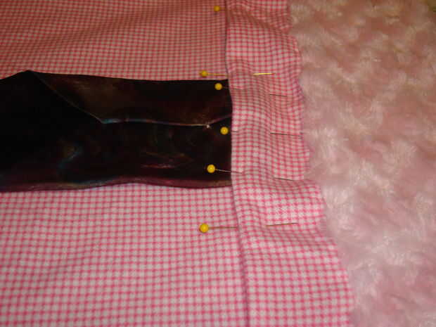 • Girar bajo la cruda 1/2 pulgada del borde y doblar esta parte sobre la costura de la almohada y el pin en el dobladillo, como se muestra.