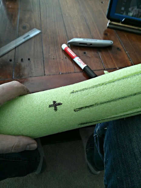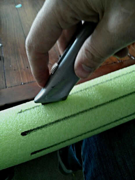 Utilizando el cuchillo para moquetas-seguí cuidadosamente a lo largo de cada una de las líneas que había hecho, asegurando que corté todo el camino a través del centro hueco para toda la longitud de la línea. Era necesario ir al menos dos veces sobre cada uno de los cortes.