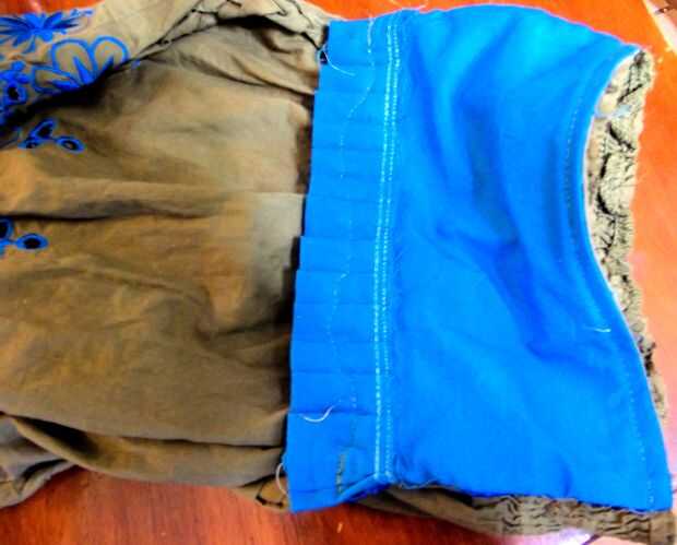 Dobladillo todo el camino alrededor de la parte superior de la falda. Entonces centro su blusa en la parte delantera de su falda con el revés hacia arriba. Esto va cosido en el interior de su borde.