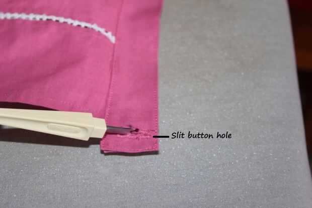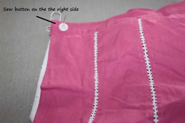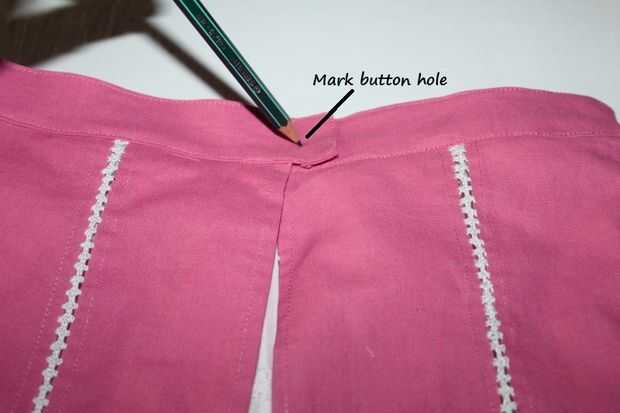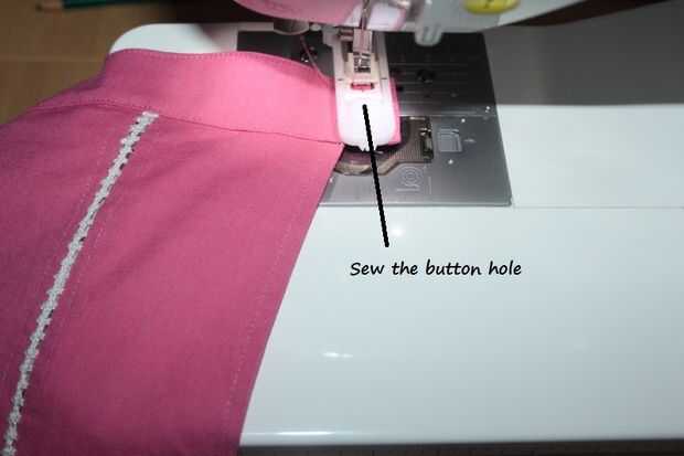 Sobre la banda de cintura a la izquierda sobre la derecha de la vuelta y marca el ojal. Después de coser el ojal corte cuidadosamente el ojal. Coser el ojal a la derecha.