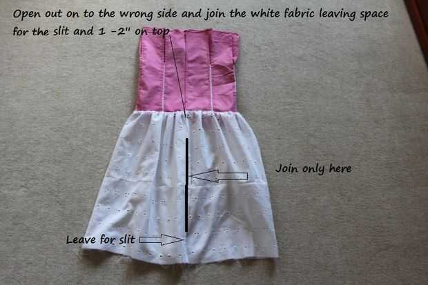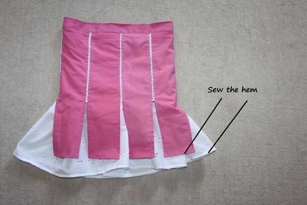 Abra la falda en el lado equivocado y unir la falda blanca sobre laping la izquierda sobre la derecha, dejando espacio en la parte superior de aproximadamente 2 pulgadas. Si desea puede dejar para la abertura o coser hacia abajo.  Ahora doble 1/4 pulgadas y coser el dobladillo de color rosado y blanco...