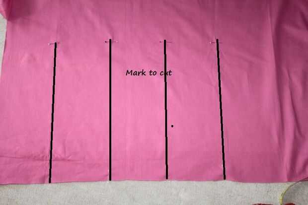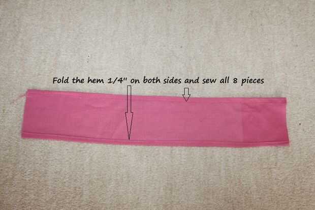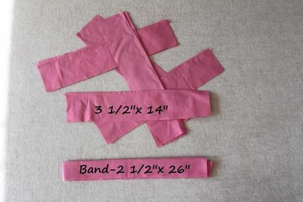 Difundir hacia fuera el material y marca las medidas que desea cortar. Yo he marcado con un alfiler. A continuación corté 8 bandas / tiras del tamaño de 3 1/2 x 14 pulgadas incluyendo costura subsidio 1/4 de pulgada en todos los lados. Cortar otra banda de la cintura a la medida de 2 1/2 x 26 pulgadas, esto también es con el permiso de la costura. Doble 1/4 pulgadas en ambos lados y coser el dobladillo en todos /strips de 8 bandas