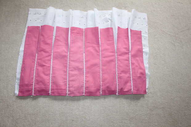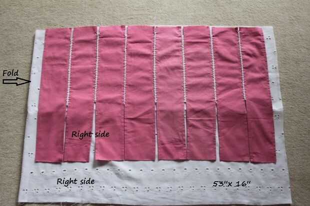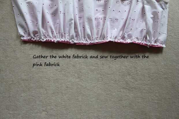 Coloque la tela del cordón blanco hakoba plana sobre una superficie, doblar dos y cortar el blanco falda interior, un poco más larga que la falda exterior y el ancho tiene que ser doble en tamaño que la tela rosa. (53'' x 16'') Volante de la tela blanca y attatch juntos con la tela rosa. Hice una puntada virada a mano primero y luego ambos juntos.