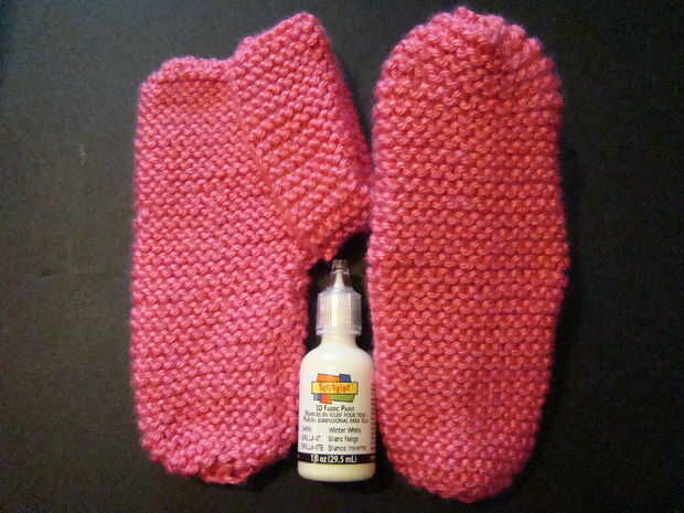 Primero que quería hacer las zapatillas para que mis nietos no deslizan en el piso de madera mientras usarlos, especialmente el bebé que está caminando y no llevar calcetines porque él se desliza al usarlos.  Así que hice una búsqueda en Google y descubrió que personas estaban usando puff tela pintura para hacer la parte inferior de las zapatillas (etc.) menos resbaladizo.  No tengo ninguna, así que compré una botella de blanco.