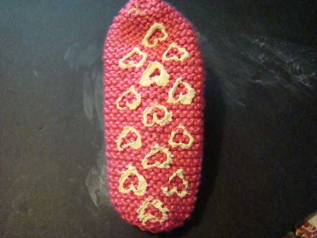 Una vez que terminaron las zapatillas, los entregó para que las plantas fueron para arriba.  Utilicé la pintura puff para dibujar diseños sobre la suela de cada zapatilla.  Para la nieta, le puse corazones.  Repita el procedimiento en la otra zapatilla. Dejar secar durante 24 horas.