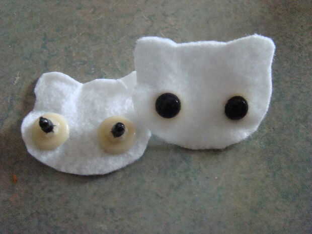 corté pequeños agujeros donde los ojos se y poner los ojos de seguridad en sus lugares. Usé las tijeras para cortar las espaldas (de los ojos de seguridad) que salían demasiado.