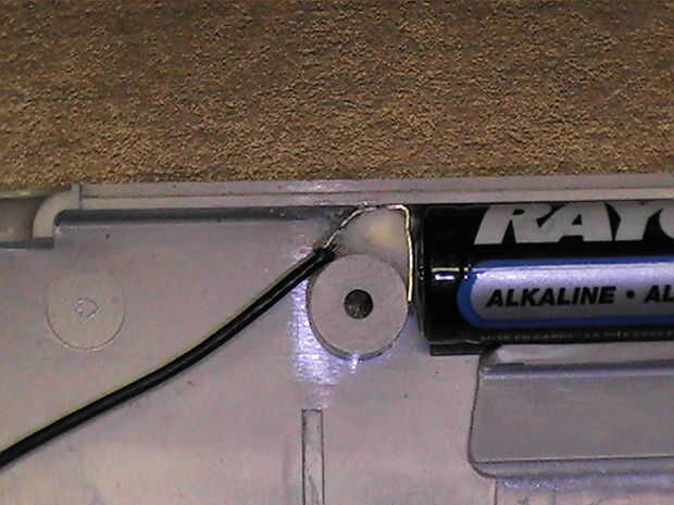 De la tarjeta de regalo de Blue Ray, sacó el portapilas. Puede utilizar cualquier metal similar que conduce la electricidad y es flexible.