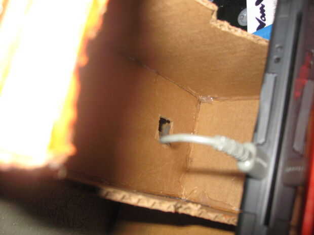 corte un agujero en la parte posterior para que el cable del cargador puede ir aunque. (como se ve en la figura 2)
