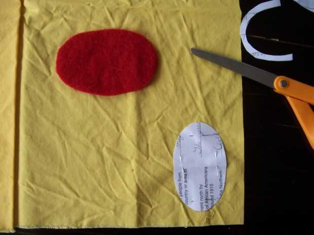 Cortar tres óvalos de la tela de desecho usando las plantillas que acaba de hacer: rojo = grande, amarillo = medio, blanco = pequeño.