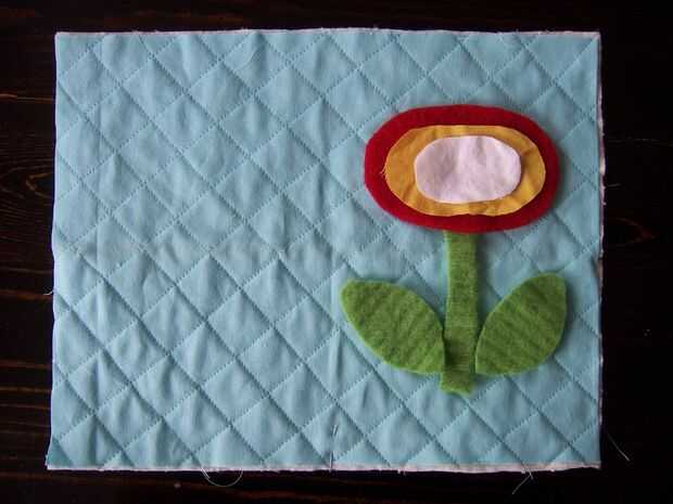 Extienda su tejido acolchado 9 x 12.5 y pin el óvalo rojo y tallo verde a la derecha. Cosa en lugar de costura de 1/4 de pulgada desde el borde del óvalo. Luego seguir cosiendo en el tallo, hojas, amarillo oval, luego oval blanco.