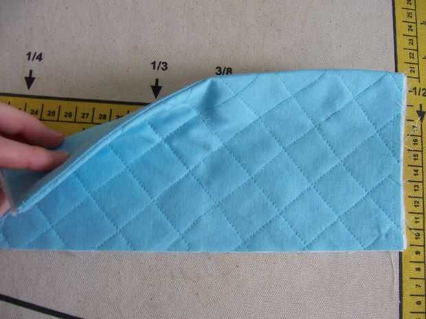 Doblar el rectángulo de 6 x 6,5 que corta de la tela aqua en un rectángulo de 6 x 3.25. Siguiendo el método descrito en la parte superior de este paso, coser alrededor de los tres bordes desplegados, dejando una abertura para dar vuelta de 1,5 pulgadas. Gire a la derecha hacia fuera.