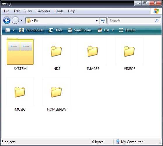 Sus roms NDS pasará allí. El firmware de la mayoría (* todos?) flashcarts está diseñado para buscar en esa carpeta para tus roms. Si tienes una microSD grande como 6 GB +, entonces asegúrese de no colocar más de 128 roms en cada carpeta. En su lugar hacer otro llamado F:/nds1/ y navegar allí utiliza explorador de archivos de la flashcart para lanzar esas roms. Compruebe con su manual de flashcart para ver si este límite rom 100 se aplica a usted. Usted sabrá si la carpeta /nds/ muestra archivos 0."