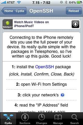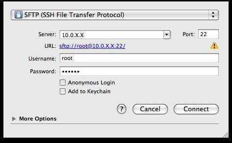 Necesita instalar un programa llamado OpenSSH desde Cydia (es como la AppStore del iphone pero se agrega cuando jailbreak el teléfono). Esto le permitirá acceder a los archivos en tu iphone. Ahora, usted puede descargar cualquier programa de ftp para conectar a tu iphone. He probado cyberduck y fugu y gustó cyberduck mejor. Sin embargo, esto fue antes de que encontró Netatalk, también en Cydia. Si instalas esta app, tuve que respring y reinicie mi iphone antes de que podría funcionar, entonces puede acceder a tu iphone desde tu ordenador en una red compartida. Si usted quiere probar la manera dura sólo asegúrese de que usted tiene SSH. Abrir cyberduck, golpe conexión abierta, menú desplegable a SFTP (SSH File Transfer Protocol), mira la dirección IP de teléfono ajustes-wifi-azul flecha junto al nombre de la red, nombre de usuario es "root" y contraseña es "alpine" sin comillas. Ahora deberías estar conectado a su teléfono. Vas a tener que crear dos archivos. Navegar a través de var, móvil y crear una carpeta llamada "ROMs" dentro de la carpeta de los medios de comunicación. A continuación crear una carpeta con el nombre "NES" dentro de esa carpeta. Otra vez, sin comillas y se distinguen mayúsculas y minúsculas.