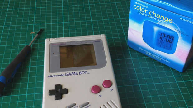Lo que necesita; Un viejo roto Nintendo Game Boy no le importa cortar, barato reloj despertador digital sobre el mismo tamaño que la pantalla de Game Boy.