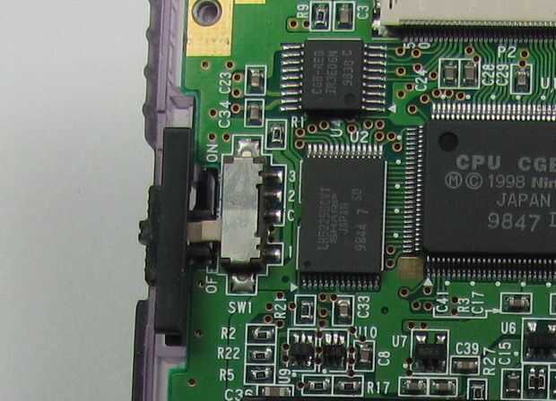 El interruptor de alimentación de estos dispositivos tienen similares dimensiones físicas como el interruptor GBC y un pinout similar. Pero con uno sólo no - por la misma razón que simplemente no puede tirar en cualquier otros SMD interruptor. El brazo es demasiado corto para caber en la botella plástica en el caso.