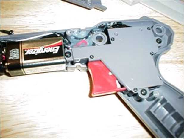 Conectar el interruptor de disparo diodo láser y clip de la batería así que cuando usted tira el gatillo la batería da energía para el diodo. Pegamento caliente todos los cables por lo que permanecen en el lugar.