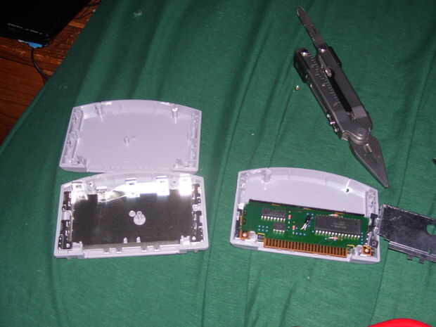 Que tienes abierto, ahora lo limpie hacia fuera. A menos que piense en mantener el funcionamiento del juego (es posible, pero no lo hice), se puede tomar la mayoría de estas cosas hacia fuera. Guarde la tabla y la pieza negra de plástico en la parte inferior para más adelante. Dependiendo de cómo usted lo quiere para abrir y cerrar, puede interrumpir los clips que celebran juntos la parte inferior del cartucho. Recomiendo hacer esto.