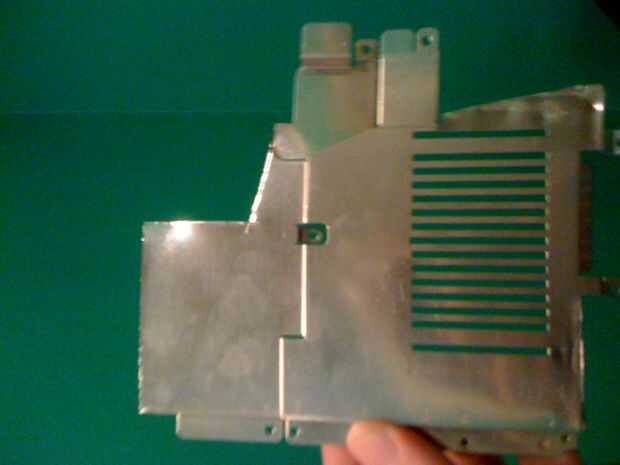 Finalmente, se debe cortar el pedazo grande de metal que cubre la placa principal de Wii. Para asegurar que la Wii tiene suficiente enfriamiento, la corté para caber apenas sobre el adaptador de Bluetooth y el procesador. Coloque el disipador sobre el procesador, coloque esta pieza de metal en lugar y traza donde usted cortará con un marcador mágico (véase abajo).
