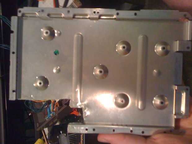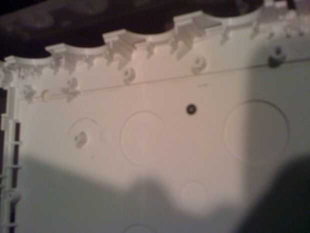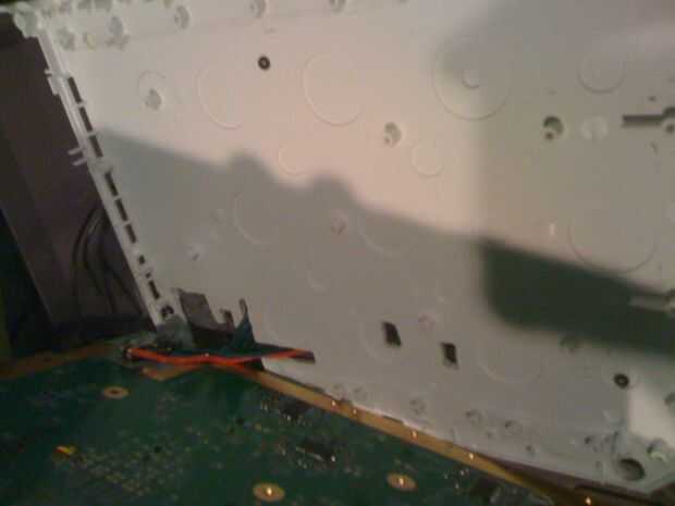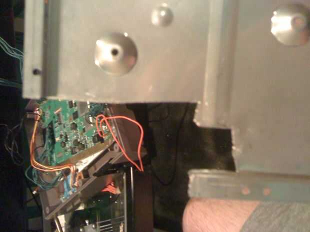 En la parte inferior de la caja de la NES, perfore un pequeño agujero para el botón de sync y el interruptor de tarjeta SD [es]. Verifique que su conmutador [es] o botón puede caber a través del agujero antes de proceder. Asumiendo que usted utiliza el mismo estilo micro-botón para el botón de eject, también taladro un agujero directamente frente el DVD drive (véase abajo). Con el botón insertado, la solapa superior todavía debe ser capaz de cerrar. ASEGÚRESE DE QUE NO PERFORAR ACCIDENTALMENTE EN LA UNIDAD DE DVD SÍ MISMO!!!!!! (Nota: este botón no debe ser instalado aún)