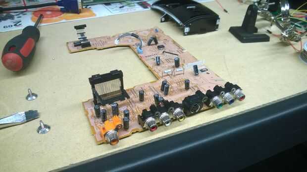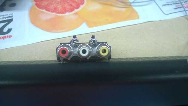 Búscate un viejo reproductor de VHS o DVD y desoldar el Puerto AV (rojo, amarillo, blanco). Esto es donde se conecta el "Video Out to TV" y los puentes de audio. La señal de vídeo vendrá de su circuito de amplificador de video. El audio se saltó directamente desde el segundo punto de soldadura (del área mod RF) en el tablero.