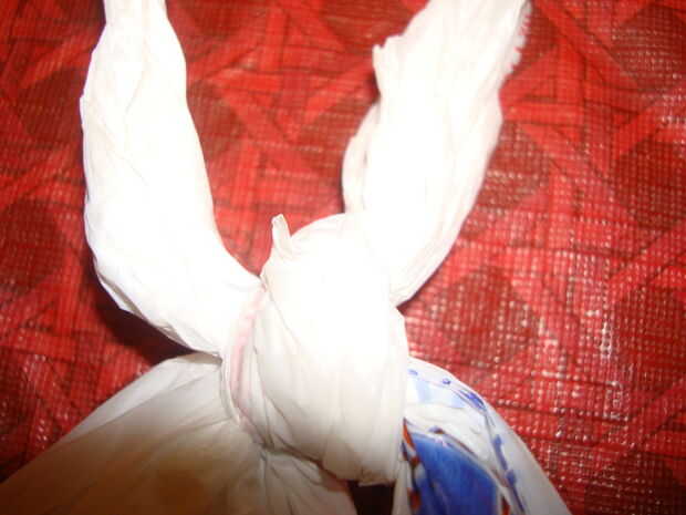 Juntar tres bolsos y un nudo plano.  Situarlos bajo un objeto pesado, como se muestra en la imagen y hacer una trenza apretada todo el camino. Un nudo plano en el extremo.
