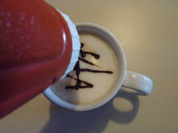 5. Llene un ketchup plástico o botella comprimible mostaza con jarabe de chocolate le-bet (espese mina con cacao en polvo).