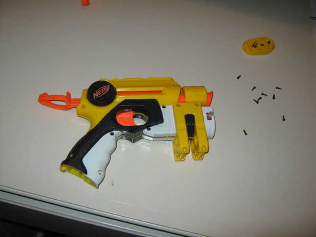 este es mi nerf nite finder han quitado los restrictores de aire y tienen streched afuera en la primavera tal vez dispara doble lo que hizo. bien así que aquí está el registro de im razón necesito ayuda tratando de convertir esto en un rifle para la