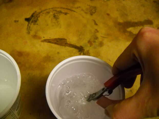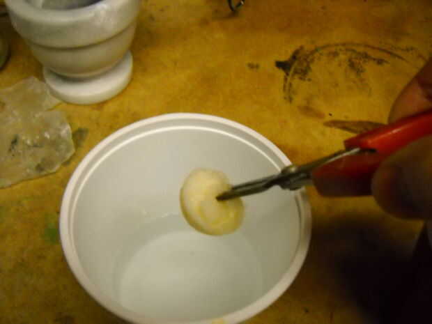 Después de pensar que ha nitrados largo suficiente, tirar la bola de algodón en el vaso y enjuague en el baño de agua. Luego muévalo hacia el baño de bicarbonato de sodio y empujón él alrededor mientras que el ácido es neutralizado por el bicarbonato de sodio. Cuando el burbujeo disminuye, reemplace el agua en el baño del avión y enjuague otra vez. Volver a ponerlo en el bicarbonato de sodio una y mueva suavemente hasta que el burbujeo completamente paradas. Luego vuelva a colocar el agua en la otra taza y enjuagarlo una última vez. (Nota, he leido que el bicarbonato de sodio lavado voluntad descomponer la nitrocelulosa, por lo que una opción mejor limpieza es hervir en agua destilada y enjuagar mucho).