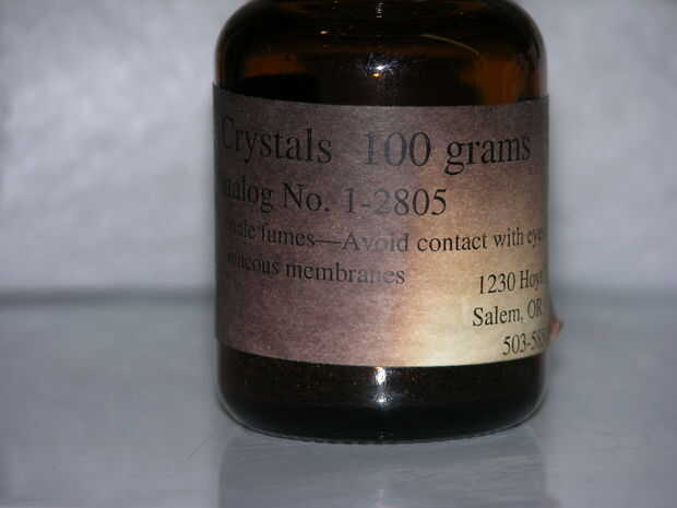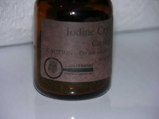 Que pasado es una web de medicina forense. Cristales de yodo se utilizan en un proceso llamado yodo fumante de elevación de huellas dactilares. Como se puede ver en la etiqueta en el frasco, el gas de los cristales ha manchado el papel a un color púrpura oscuro. Gas de yodo es tóxico, así que hacer este experimento en un área bien ventilada.