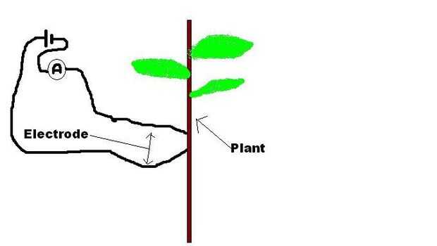 Primero que tenemos que introducir dos electrodos en una planta. Nos paso de electricidad entre el electrodo. En el otro extremo la corriente es de lectura. Automáticamente se calcula la corriente por el voltímetro / multímetro y necesario es actuar basado en la lectura.