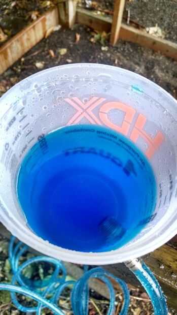 Conecte el extremo suelto del tubo a la pieza de madera de desperdicio con un par de abrazaderas de plástico. Poner algún colorante en el fondo de la cubeta y llenarla 3/4 lleno con agua. El colorante de alimento sólo le ayuda a detectar el nivel de agua en la tubería, así colorearlo como mejor parezca. Tenga cuidado de mantener el otro extremo de la tubería lo suficientemente alto que el agua no drene hacia fuera.