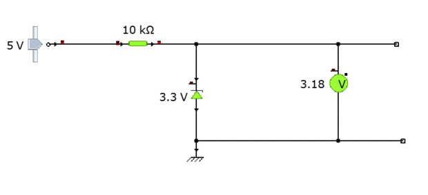 Colocar un resistor de carga en línea antes del Diodo zener, y tomando el zener a tierra, puede asegurarse la tensión que obtiene pasado que el zener está en o ligeramente por debajo de la tensión zener (Vz) del Diodo zener. En la siguiente imagen de ejemplo, se puede ver que introducir una señal de 5V salidas un 3.18V señal.