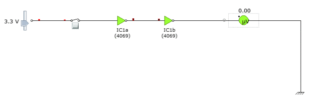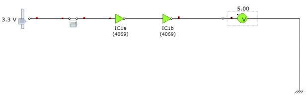 La idea es utilizar un IC que es alimentado a la tensión de objetivo como paso encima de la fuente para la amplitud de la señal. En este caso, he utilizado un 4069 Hex inversor IC. También puede usar un 74HC04 o uno de su elección. Yo uso dos de los inversores (hay seis en este IC) para tomar la señal y de paso la salida para el Vcc de la IC. No hay ninguna magia en la elección de dos inversores: inversión, por eso he querido mi entrada alta para mantener una producción alta en lugar de ser invertido.