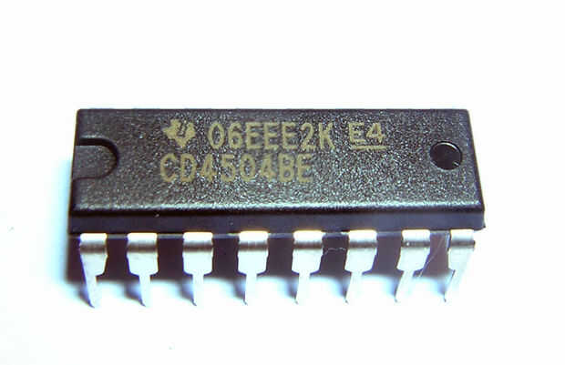 CD4504B hexagonal voltaje nivel-desplazador consta de seis circuitos que cambiar las señales de entrada desde el nivel de lógica de Vcc para el nivel de lógica de Vdd. Para cambiar las señales TTL a niveles de Lógica CMOS, la entrada de selección es en el estado de lógica Vcc alta. Cuando la entrada de selección está en un estado lógico bajo, cada circuito traduce señales de un nivel CMOS.