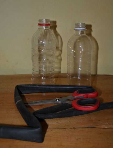 Sólo necesita dos botella pequeña de plástico transparente, un neumático de bicicleta usada (sin los agujeros) y un par de tijeras.