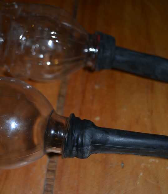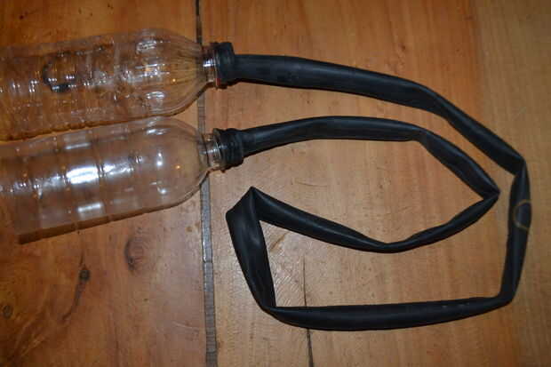 Coloque cada lado abierto del tubo interior en cada cuello de las botellas (como en las fotos)