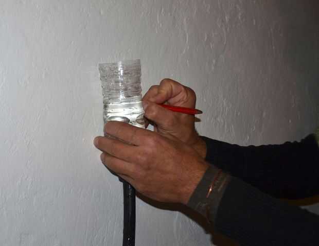 Coja a los dos firma en la pared para pocos segundo y marcan el nivel del agua con un lápiz.