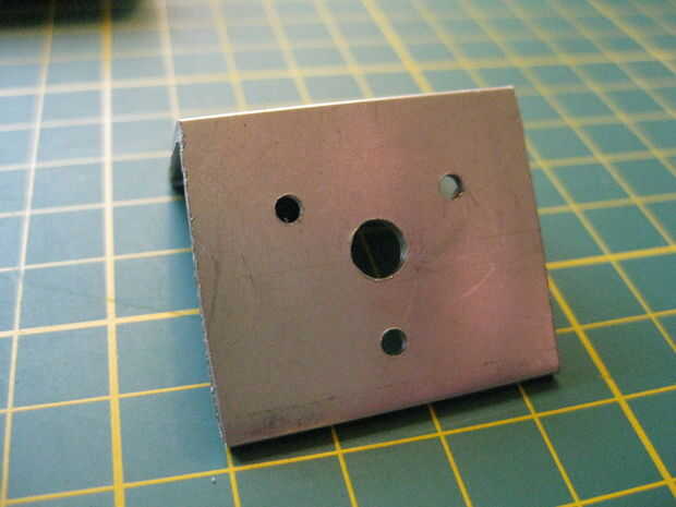 Con una paz de ángulo de aluminio de 25x25x1.5mm taladré agujeros para que coincida con los agujeros roscados en el motor de disco duro, esto se hizo con el collar que sostiene los platos del disco duro en lugar de mi plantilla de taladrado.