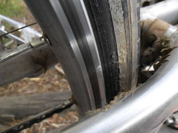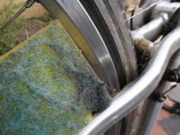 Cuando la llanta está fuera verdadero, la espiga se frota contra el borde, con un "silencio" que funciona encima de la zona baja y un "ssssttttt" donde frota en la mancha alta. Así como la rueda gira lo hace un "silencio" - "ssssttttt" - "silencio" - "ssssttttt"-"silencio" - "ssssttttt"-"silencio" - "ssssttttt".
